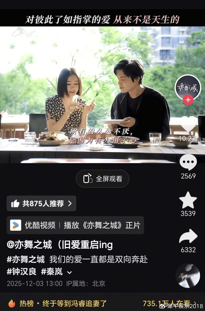 官抖里两条点赞破百万的短视频中,一条是男女主在分离十二年后的“爱人错过”桥段,仅是两人相互交叠的身影搭配上动人的主题曲BGM就已足够;另一条便是前任与现任三人饭局对峙的刺激场面,旗鼓相当的对手戏毫不意外地招来了不少“吃瓜”群众。