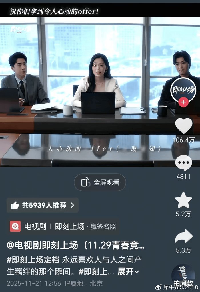 都市职场剧《即刻上场》亦不甘示弱,光是定档时与原版综艺《令人心动的offer》的一条联动视频就有100万+点赞,同时还有租房困境、职场竞争、社畜加班、办公室恋情等现实议题引发普通打工人共鸣。