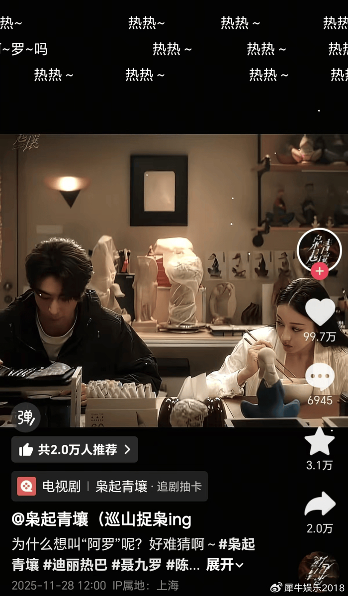 都市奇幻题材的《枭起青壤》也把CP营销玩的得心应手,其官抖置顶的第一条视频用一碗面的试探和一句“我能叫你阿罗吗”成功拿捏住了成年人之间的暧昧氛围和情感的水到渠成,单条视频转评赞已超百万。