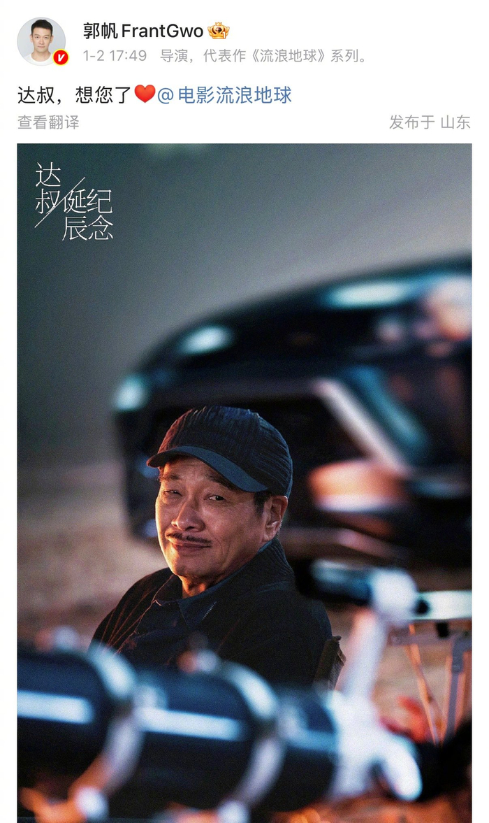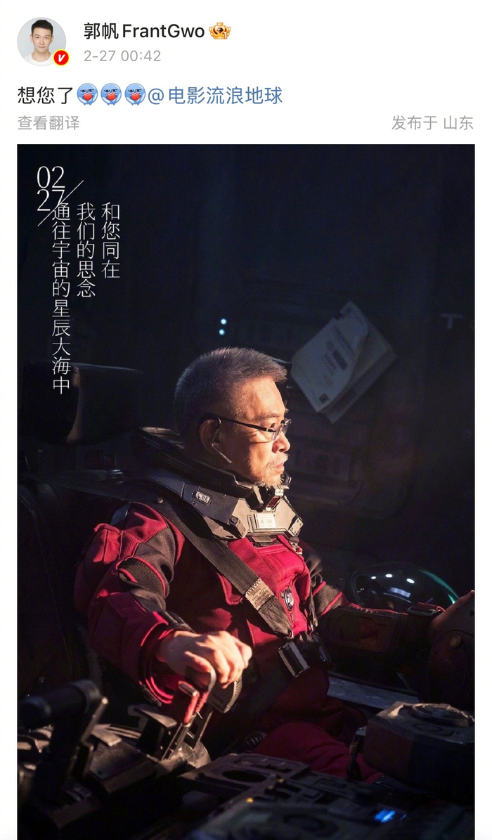 #郭帆今年第二次发文纪念吴孟达#【网友建议:#用最新AI在流浪地球3复活姥爷#】2月27日,吴孟达去世五周年之际,《流浪地球》系列导演@郭帆FrantGwo 凌晨发文“想您了”,并配了一张吴孟达在《流浪地球》中的海报剧照。这是郭帆今年第二次发文纪念吴孟达,上次是1月2日。