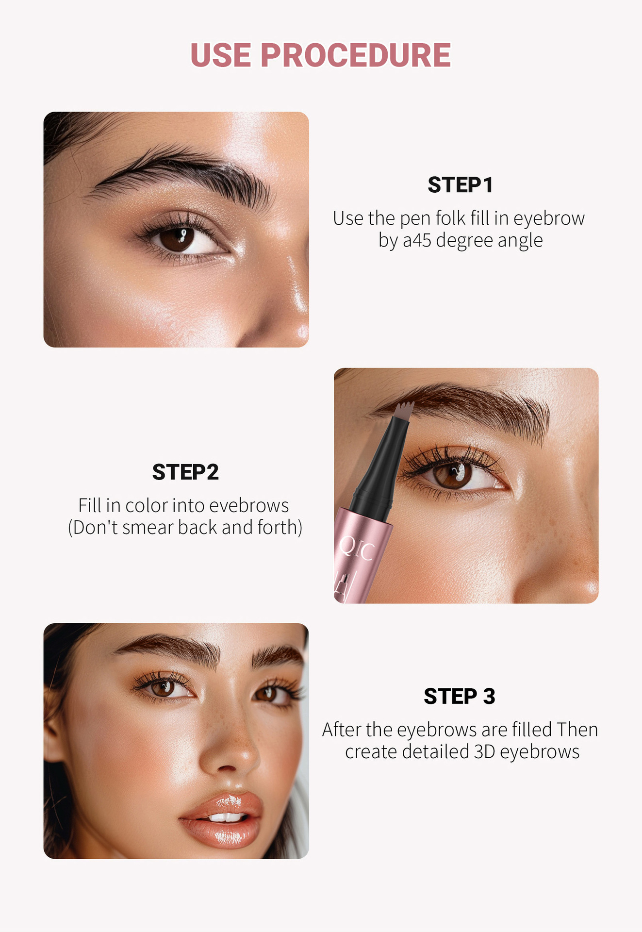 跨境彩妆QIC玫瑰金四爪眉笔 野生眉防水顺滑不晕染四叉液体眉笔
