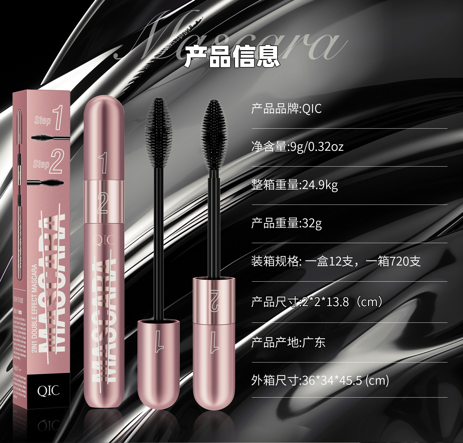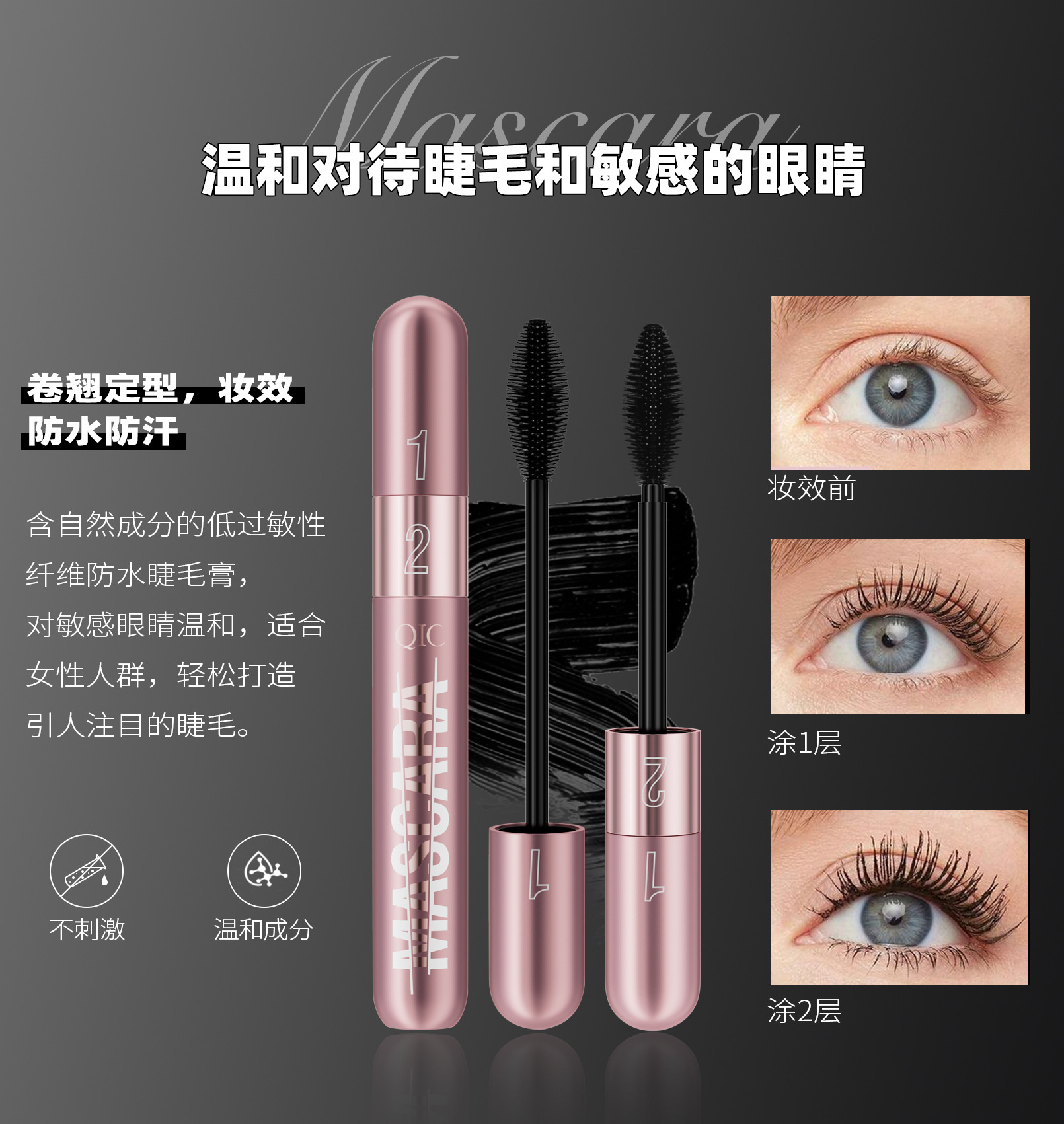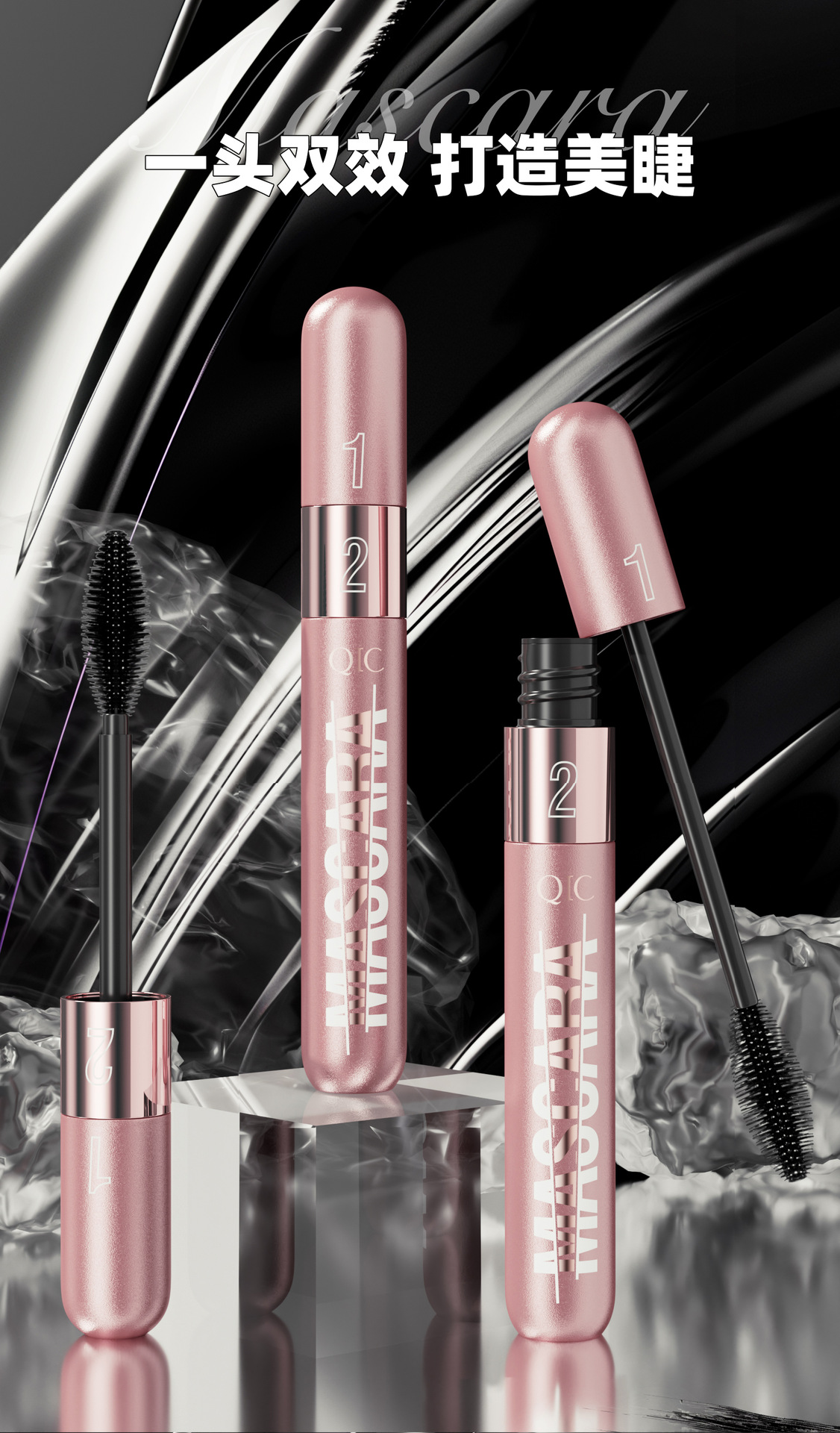 QIC新品玫瑰金双效睫毛膏浓密纤长二合一防水不晕染卷翘睫毛膏