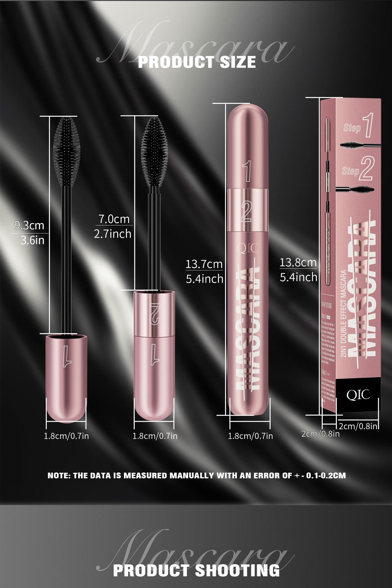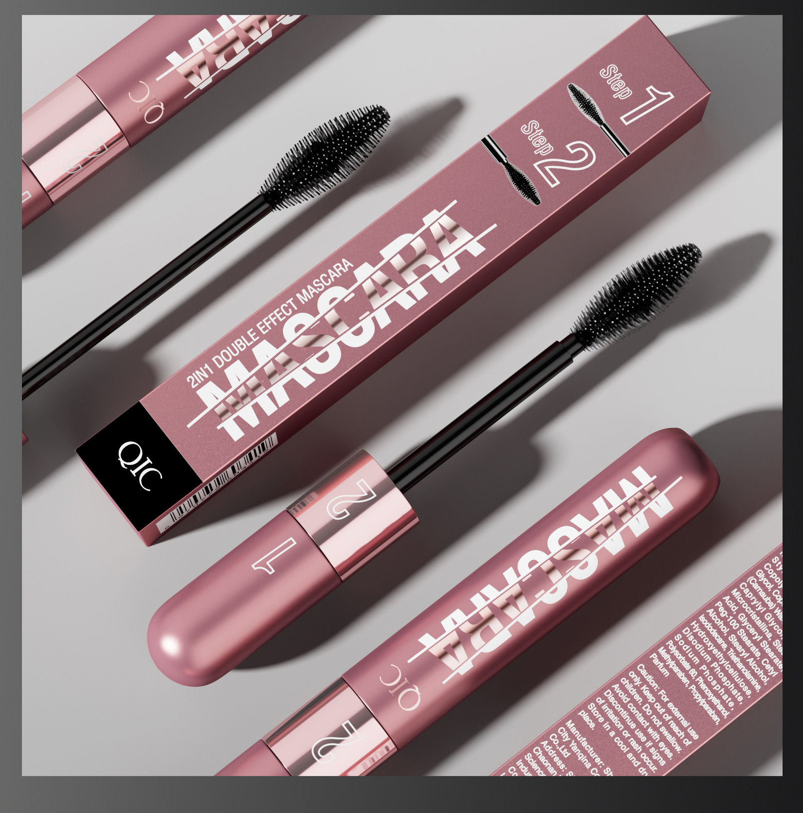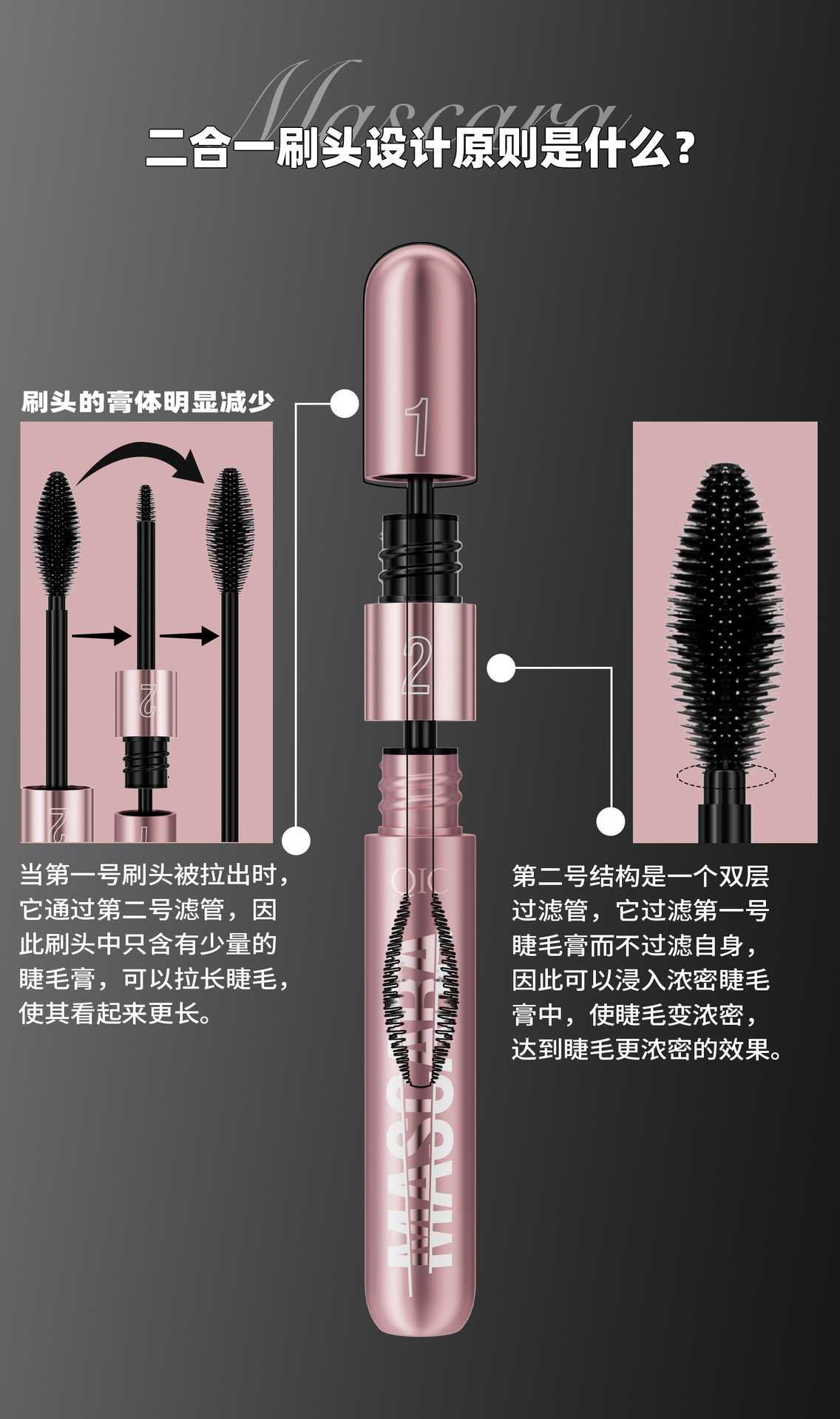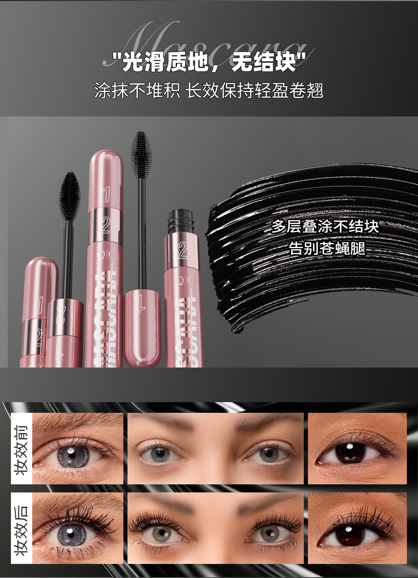 QIC新品玫瑰金双效睫毛膏浓密纤长二合一防水不晕染卷翘睫毛膏