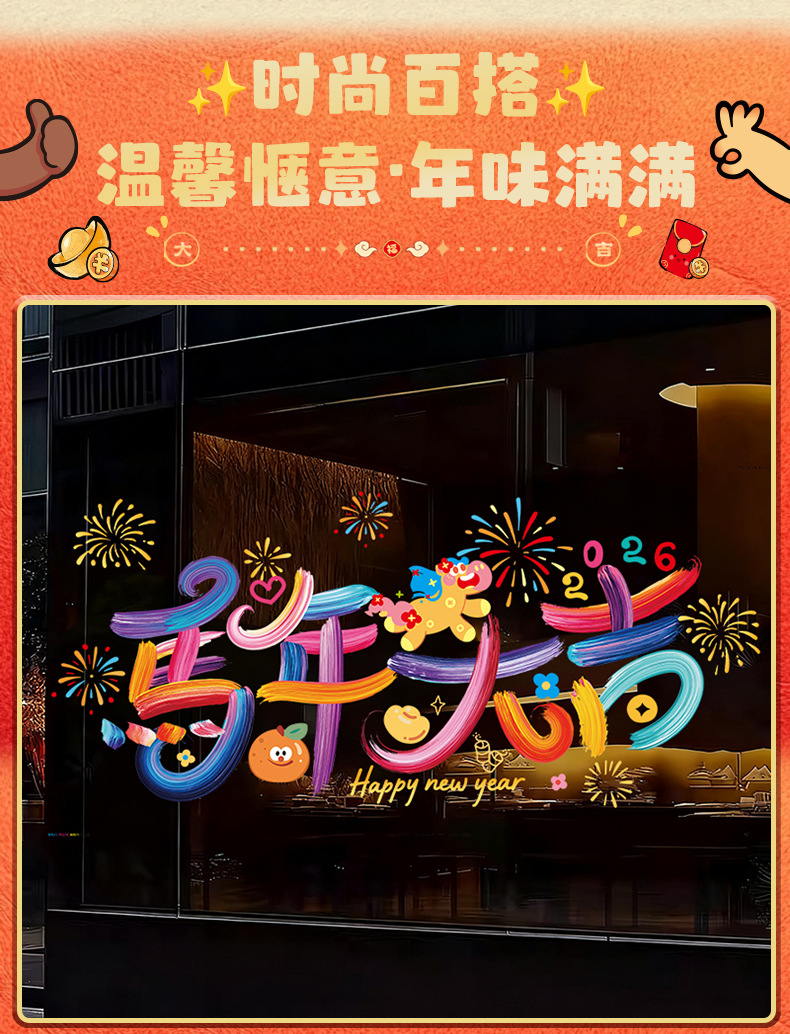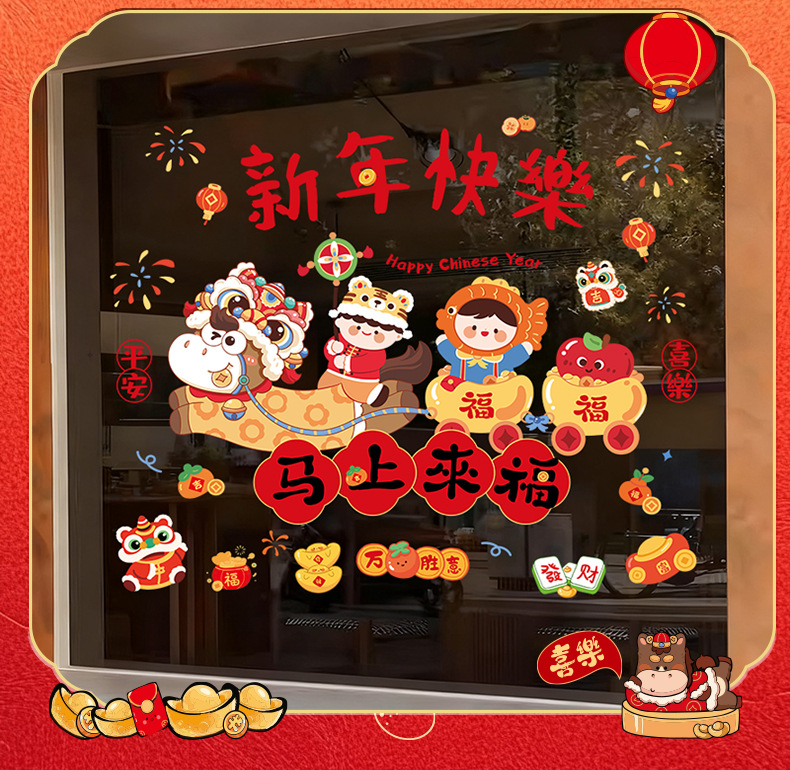 2026马年玻璃窗贴新年静电贴橱窗装饰窗花福字商场布置玻璃门贴