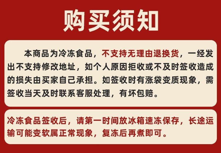 感谢亲亲的信任,由于食品类目的特殊性,为了食品安全着想,产品不支持7天无理由退换货,特别是冷冻食品,不支持拒签和退换货,希望大家能够理解,谢谢了!!!!