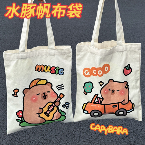 卡皮巴拉帆布袋学生卡通高颜值收纳手提袋布料包装可爱水豚帆布包